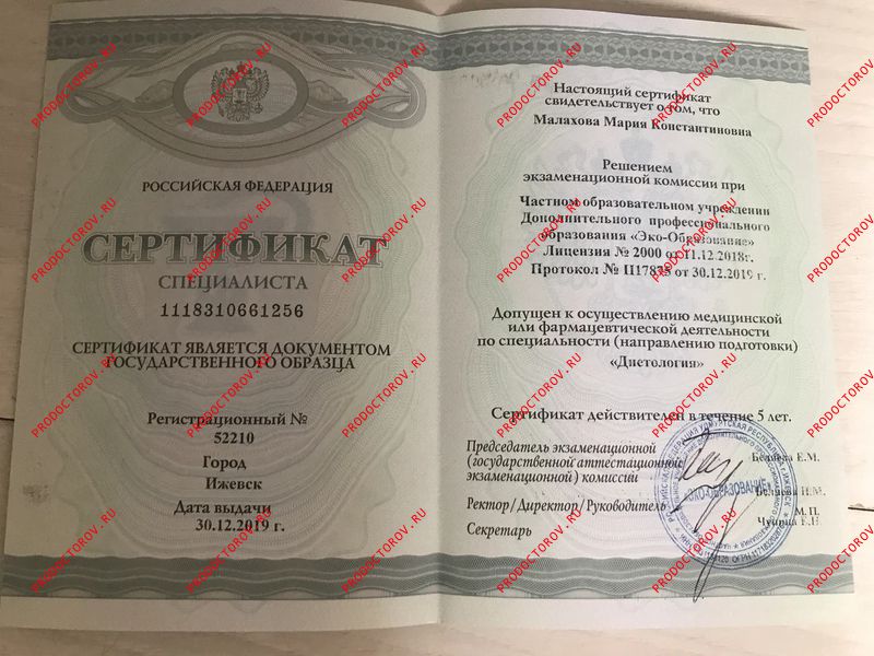 - 2018 г. Ижевская государственная медицинская академия. Диетология (переподготовка).