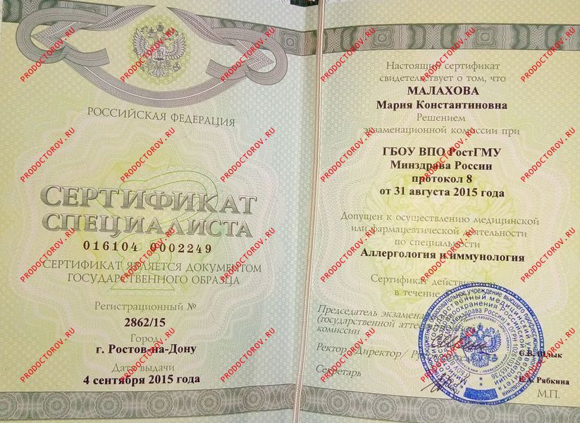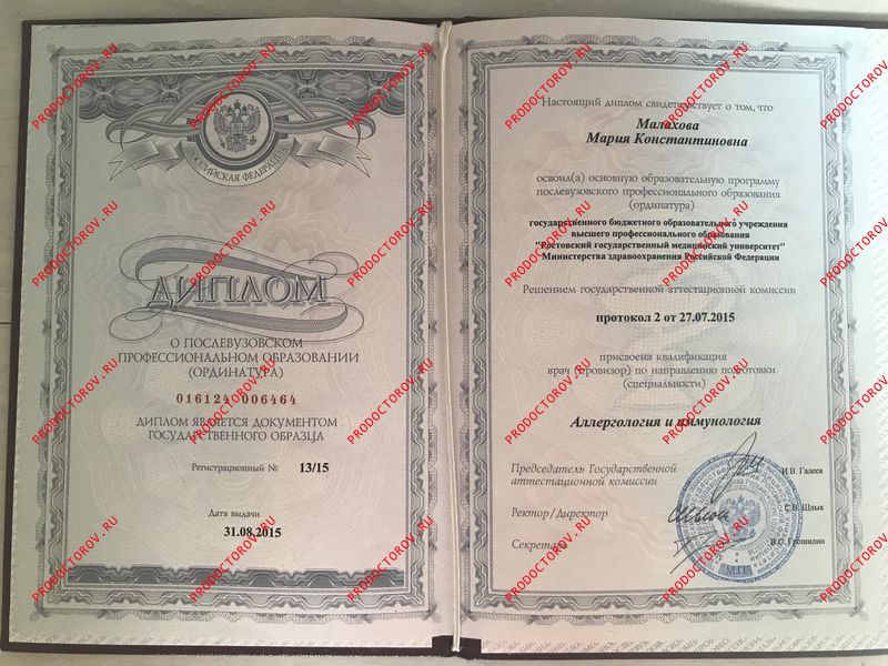 - 2015 г. Ростовский государственный медицинский университет. Аллергология и иммунология (ординатура)