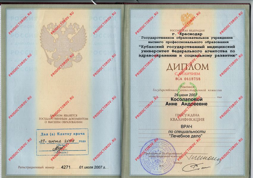 - 2007 г. Кубанский государственный медицинский университет. Лечебное дело (базовое образование)