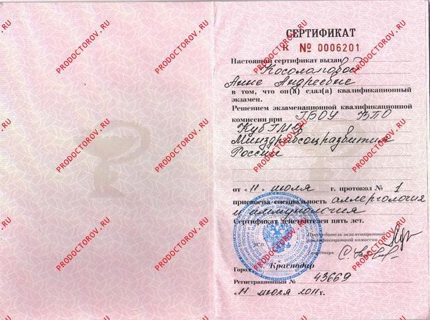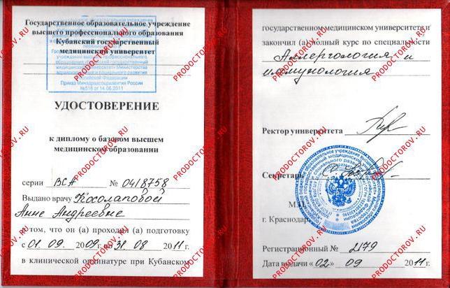 - 2011 г. Кубанский государственный медицинский университет. Аллергология и иммунология (ординатура)
