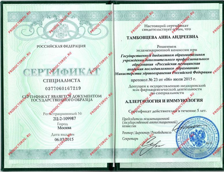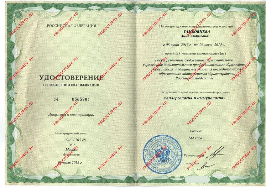 - 2015 г. Российская медицинская академия последипломного образования (РМАПО). Повышение квалификации